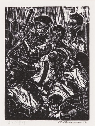 Another local artist, Choo Keng Kwang, made the woodblock print titled 5-1-3 that captures the political tensions of the day. The title refers to 13 May 1954, when Chinese middle school students in Singapore protested against the military conscription of all males between the ages of 18 to 20 years, as required by the 1952 National Service Bill. The students felt this was unfair as it required them to defend the British colonial government who had not provided for the advancement of Chinese education. This is the artist’s impression of the clash between the students and police, which turned violent and led to 26 people injured and 45 students arrested.
