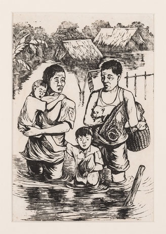 In Flood at Potong Pasir by local artist Koeh Sia Yong, the theme of loss is explored as the print portrays a family fleeing a flood, worry etched on the parents’ faces. In the 1950s, Potong Pasir was an area in Singapore with many vegetable farms that were vulnerable to frequent floods. Koeh might have made this woodcut in reference to the Potong Pasir floods of the early 1950s, which left hundreds of families stranded and destroyed crops, resulting in substantial losses of poultry and food for farmers.
